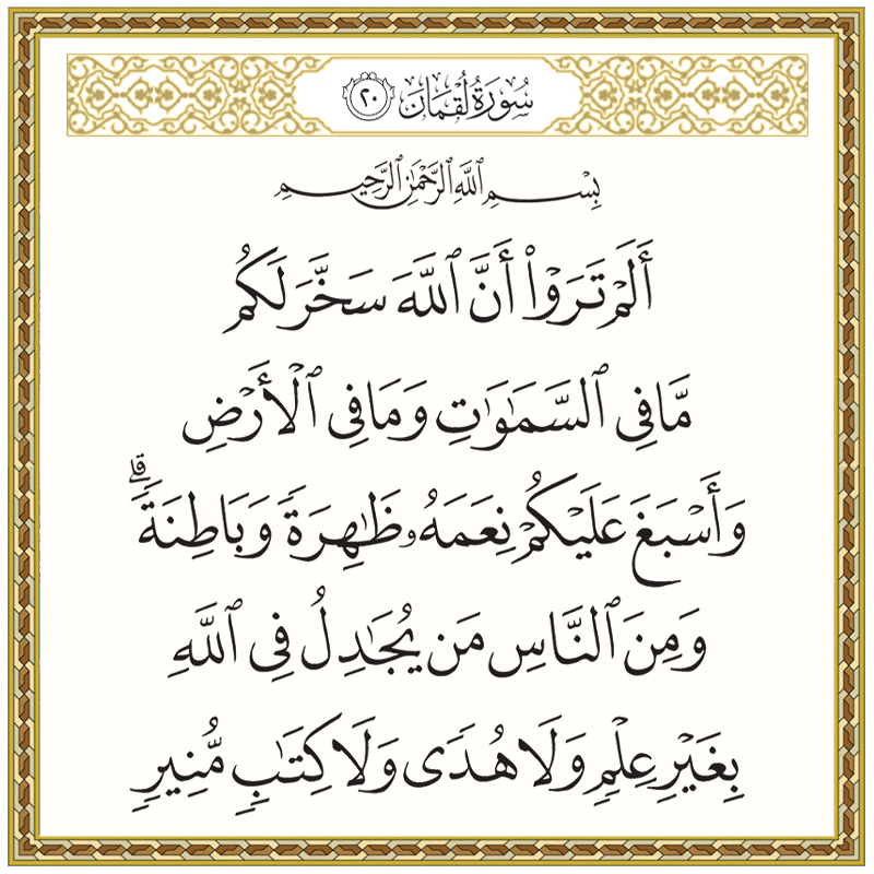 Δε βλέπετε (ω, άνθρωποι) ότι ο Αλλάχ υπόταξε ό,τι υπάρχει στους ουρανούς και στη γη (τον ήλιο, τα ζώα και τα φυτά κλπ.) για να σας ωφελήσουν, και σας έχει χαρίσει άφθονες εύνοιες απ' Αυτόν, φανερές και κρυφές; Ωστόσο, υπάρχουν ανάμεσα στους ανθρώπους εκείνοι που συζητούν για τον Αλλάχ, χωρίς (να έχουν) γνώση, ούτε καθοδήγηση, ούτε ένα (Θείο) Βιβλίο που φανερώνει (τον δρόμο τους) .
