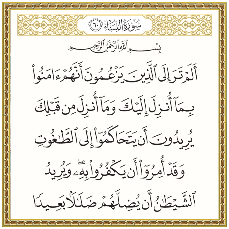 60 הלא ראית את הסוברים לחינם כי מאמינים הם באשר הורד אליך(הקוראן) ובאשר הורד לפניך (מאללה), כיצד הם רוצים להישפט לפי המסורה של (דרך) השטן, אף-על-פי שהצטוו לכפור בו? השטן רוצה להתעותם רחוק מאוד מדרך הישר.