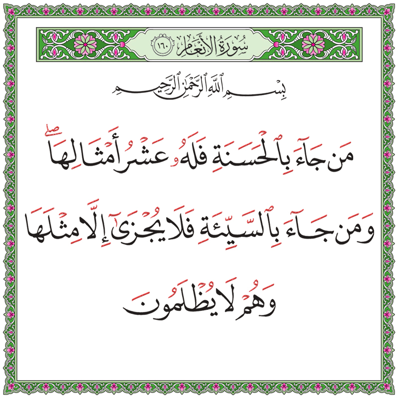 ผู้ใดที่นำความดีมา เขาก็จะได้รับสิบเท่าของความดีนั้น และผู้ใดนำความชั่วมาเขาจะไม่ถูกตอบแทน นอกจากเท่าความชั่วนั้นเท่านั้น และพวกเขาจะไม่ถูกอธรรม