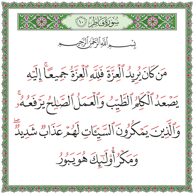 E chi desidera potenza... [sappia che] tutta la potenza [appartiene] ad Allah: ascende a Lui la buona parola ed Egli eleva alta l'azione devota. Coloro che invece tramano le azioni malvagie, avranno un castigo severo. La loro trama è destinata al fallimento.