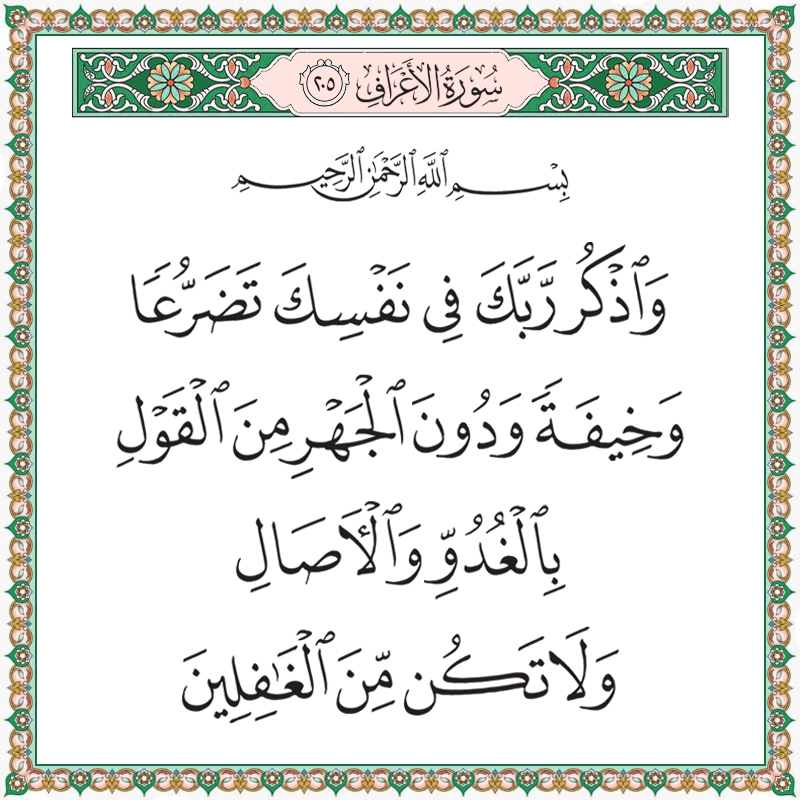 وَاذْكُر رَّبَّكَ فِي نَفْسِكَ تَضَرُّعًا وَخِيفَةً وَدُونَ الْجَهْرِ مِنَ الْقَوْلِ بِالْغُدُوِّ وَالْآصَالِ وَلَا تَكُن مِّنَ الْغَافِلِينَ