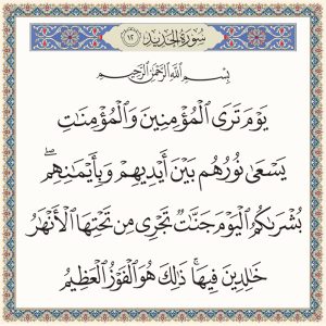 แท้จริงอัลลอฮ.จะทรงให้บรรดาผู้ศรัทธาและกระทำความดีทั้งหลายเข้าสู่สวนสวรรค์หลากหลาย ณ เบื้องล่างสวนสวรรค์มีลำน้ำหลายสายไหลผ่าน ส่วนบรรดาผู้ปฏิเสธศรัทธานั้นพวกเขาจะหลงระเริงและกินเยี่ยงปศุสัตว์กัน และไฟนรกคือที่พำนักของพวกเขา
