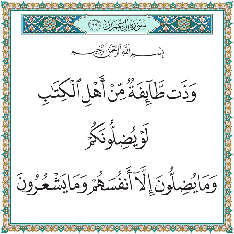 Μια ομάδα από τους ανθρώπους του Βιβλίου (Χριστιανοί και Εβραίοι) εύχεται να σας παραπλανήσουν (από την αλήθεια στην οποία σας καθοδήγησε ο Αλλάχ). Αλλά δεν παραπλανούν παρά μόνο τον εαυτό τους, και δεν το αντιλαμβάνονται.